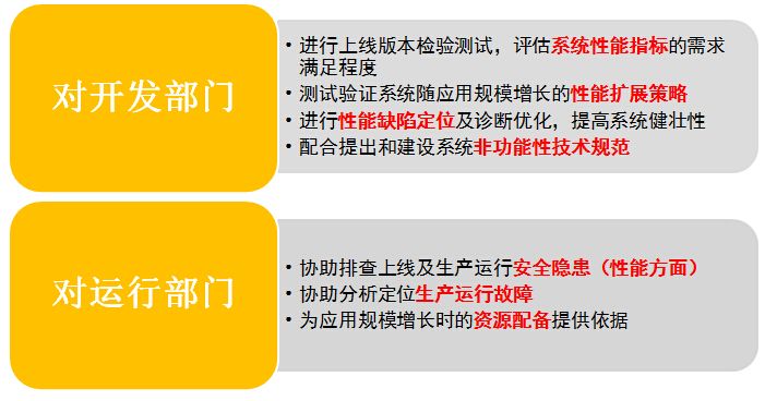 性能測試分別對開發部門和業務運營部門有不同的意義,開發部門通過性能測試可以獲取系統的最大性能指標,為開發部門提供性能擴展策略提供解決方案;通過性能調優提高系統健壯性,為系統上線運行保駕護航。對運營部門而言,性能測試可以提前發現系統的中安全隱患和性能風險,提前定位未知的性能故障,保證系統運行。